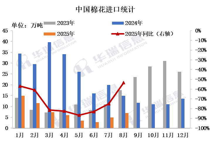 中國棉花進口:2025年8月進口7萬噸,同比(14.97萬噸)降8萬噸,環(huán)比(5.31萬噸)增1.7萬噸;2025年1-8月累計進口59萬噸,同比降72.6%,同比(214萬噸)降156萬噸;2024/25年度9-8月累計進口105萬噸,同比降68%,同比(323.63萬噸)降219萬噸。