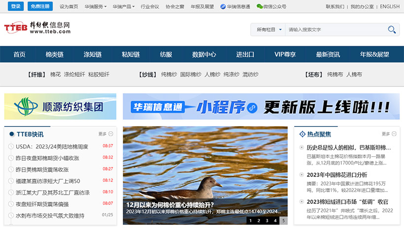 輸入hfmeishu.com 或者瀏覽器搜索“棉紡織信息網(wǎng)”進入網(wǎng)站首頁。網(wǎng)站包含滌短、粘短、棉花及其下游紗線、坯布等產(chǎn)業(yè)鏈信息。