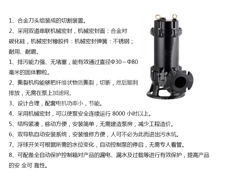 WQG 型切割污水泵整體設(shè)計合理,配套電機(jī)合理,帶有熱保護(hù)裝置,效率高,節(jié)能,廣泛應(yīng)用于企業(yè)單位、工廠、住宅區(qū)的污水排水站,也可用于化糞池、沼氣池的污水排放。WQG 型切割污水泵結(jié)構(gòu)緊湊,體積小,移動方便,安裝簡便,無需建泵房,潛入水中即可工作,大大減小工程造價。另外可根據(jù)客戶實際使用情況,配置全自動安全保護(hù)控制柜和浮球開關(guān),自動控制 WQG 型切割污水泵的啟停,保證了泵運(yùn)行可靠。