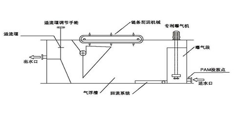 經(jīng)加藥反應(yīng)后的污水進(jìn)入氣浮的混合區(qū),與釋放后的溶氣水混合接觸,使絮凝體粘附在細(xì)微氣泡上,然后進(jìn)入氣浮區(qū)。絮凝體在氣浮力的作用下浮向水面形成浮渣,下層的清水經(jīng)集水器流至清水池后,一部分回流作溶氣使用,剩余清水通過溢流口流出。氣浮池水面上的浮渣積聚到一定厚度以后,由刮沫機(jī)刮入氣浮機(jī)污泥池后排出。