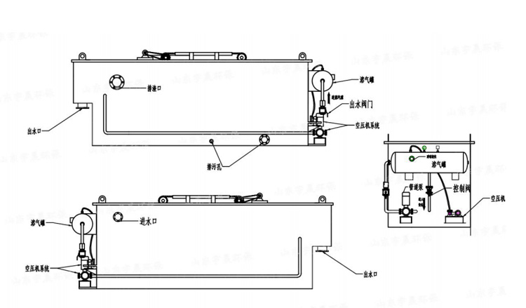 3、設(shè)備需設(shè)清洗用下水道,可挖明渠,也可直接采用管道接至調(diào)節(jié)池,以便沖洗氣浮池的水排出去。