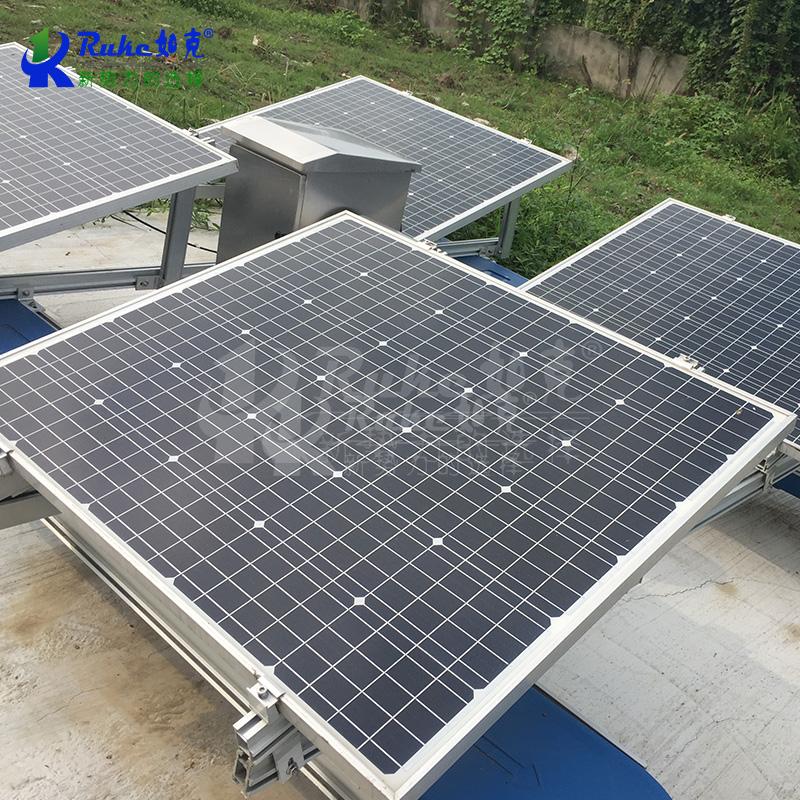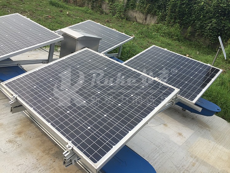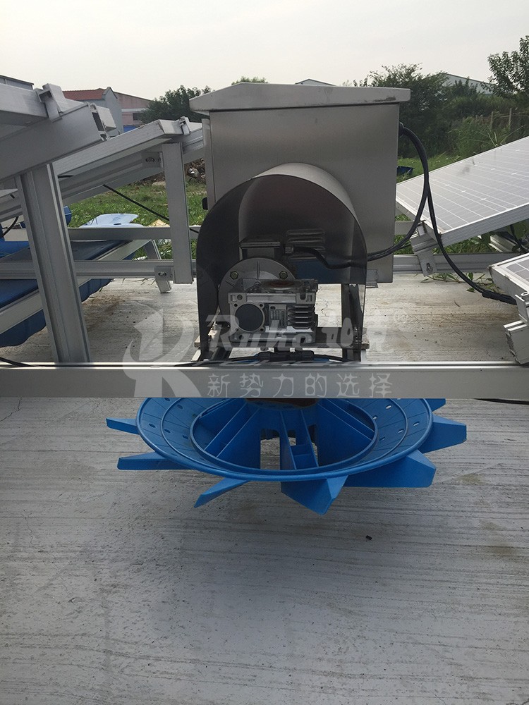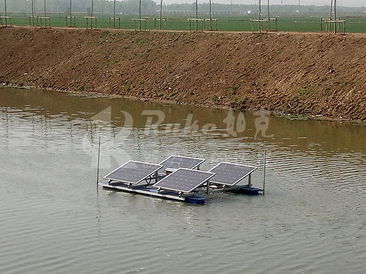 太陽(yáng)能解層曝氣機(jī)由光伏板組件、蓄電池組、表面曝氣機(jī),浮體、支架等主要部件組成,光伏帶動(dòng)表面曝氣機(jī)葉輪運(yùn)轉(zhuǎn),旋轉(zhuǎn)的葉輪攪拌水體,形成水花和水膜,擴(kuò)大水和空氣的接觸面,使氧氣和表層的有有氧物質(zhì)及藻類(lèi)快速融入水底,使表層和低層水質(zhì)快速互換,排除水底廢氣,已維持水體生態(tài)平衡。